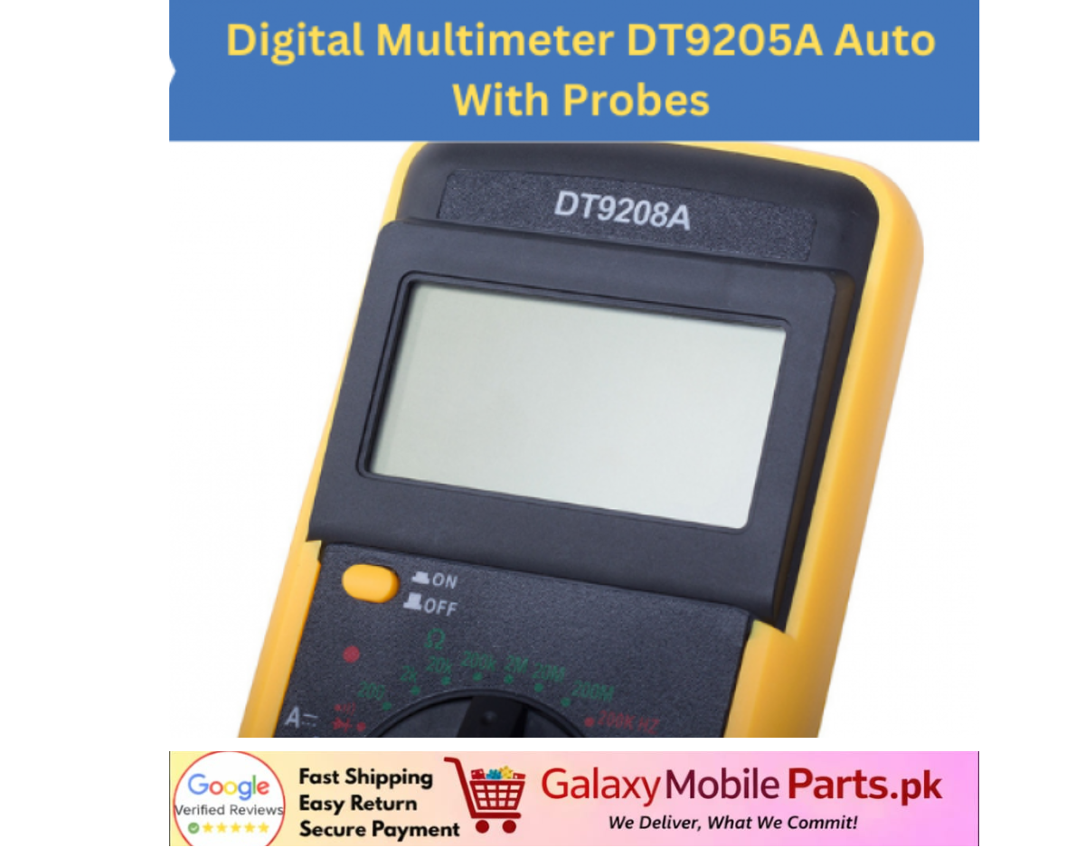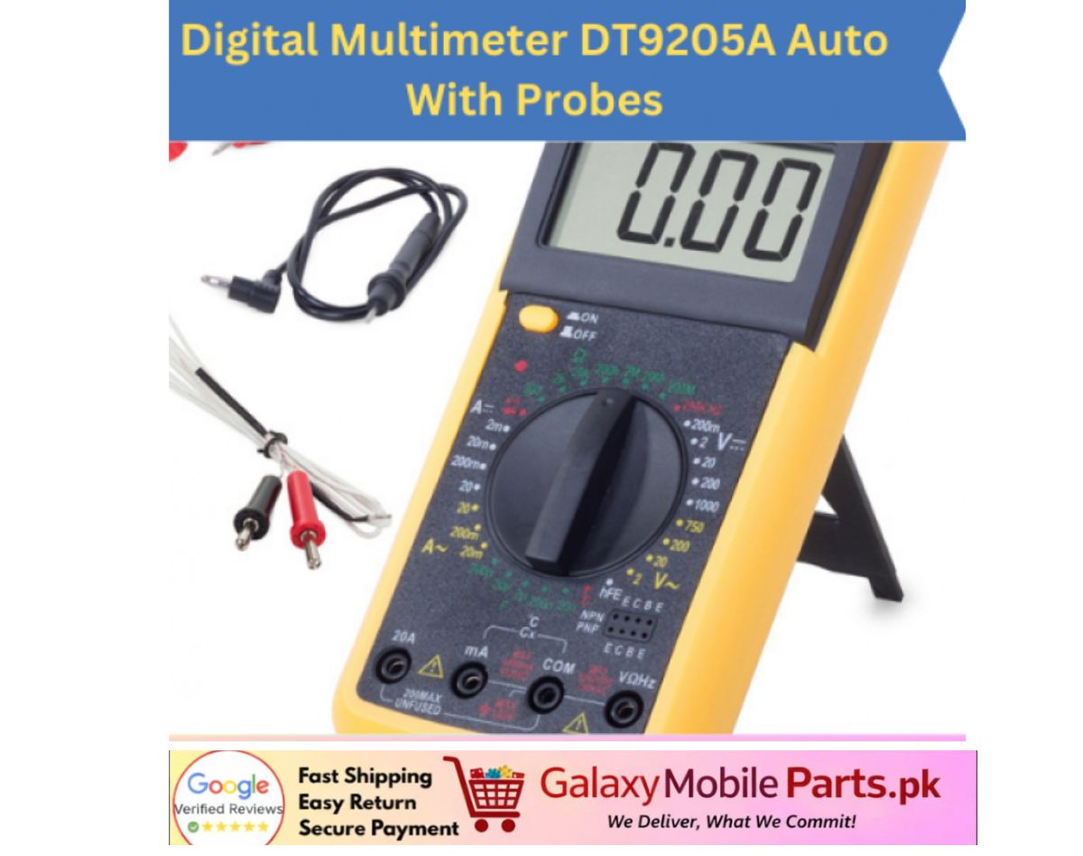 The Digital Multimeter DT9205A Auto With Probes is a highly reliable and versatile diagnostic tool designed for technicians, electricians, mobile repair experts, and DIY users. Known for its accuracy, durability, and user-friendly operation, this multimeter is ideal for troubleshooting electrical circuits, mobile phone repairs, electronic boards, home appliances, and automotive systems. Whether you’re measuring voltage, current, resistance, continuity, or testing components like diodes and transistors, the DT9205A delivers precise and consistent results every time.