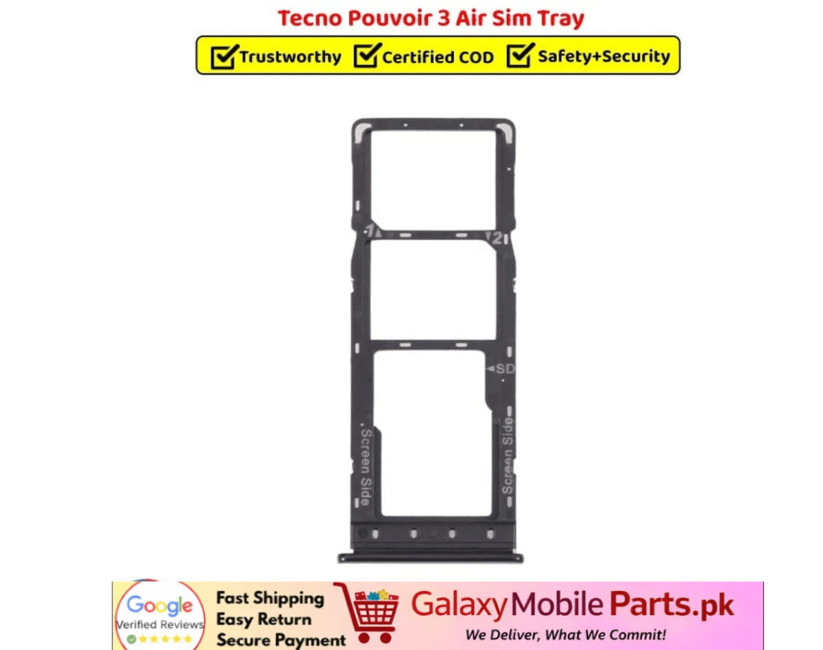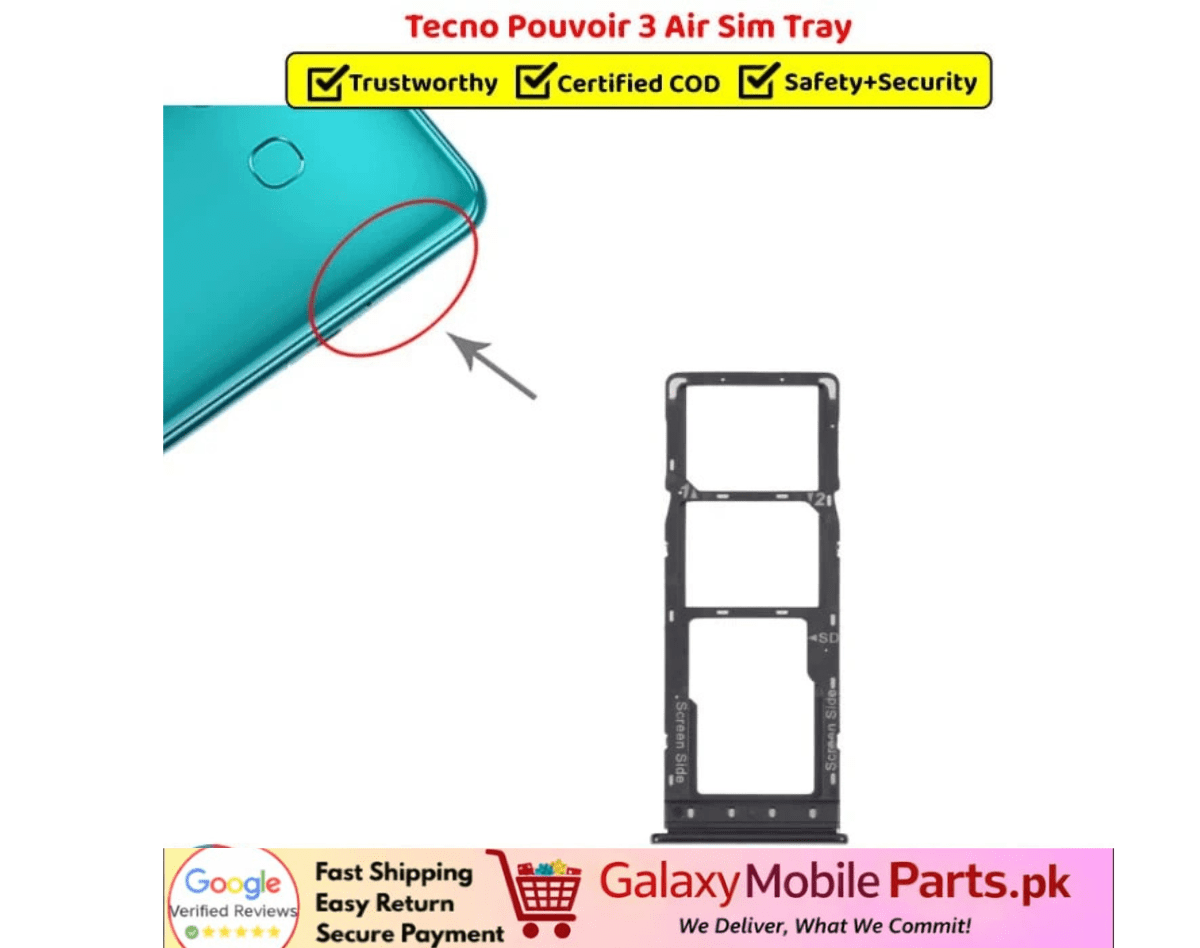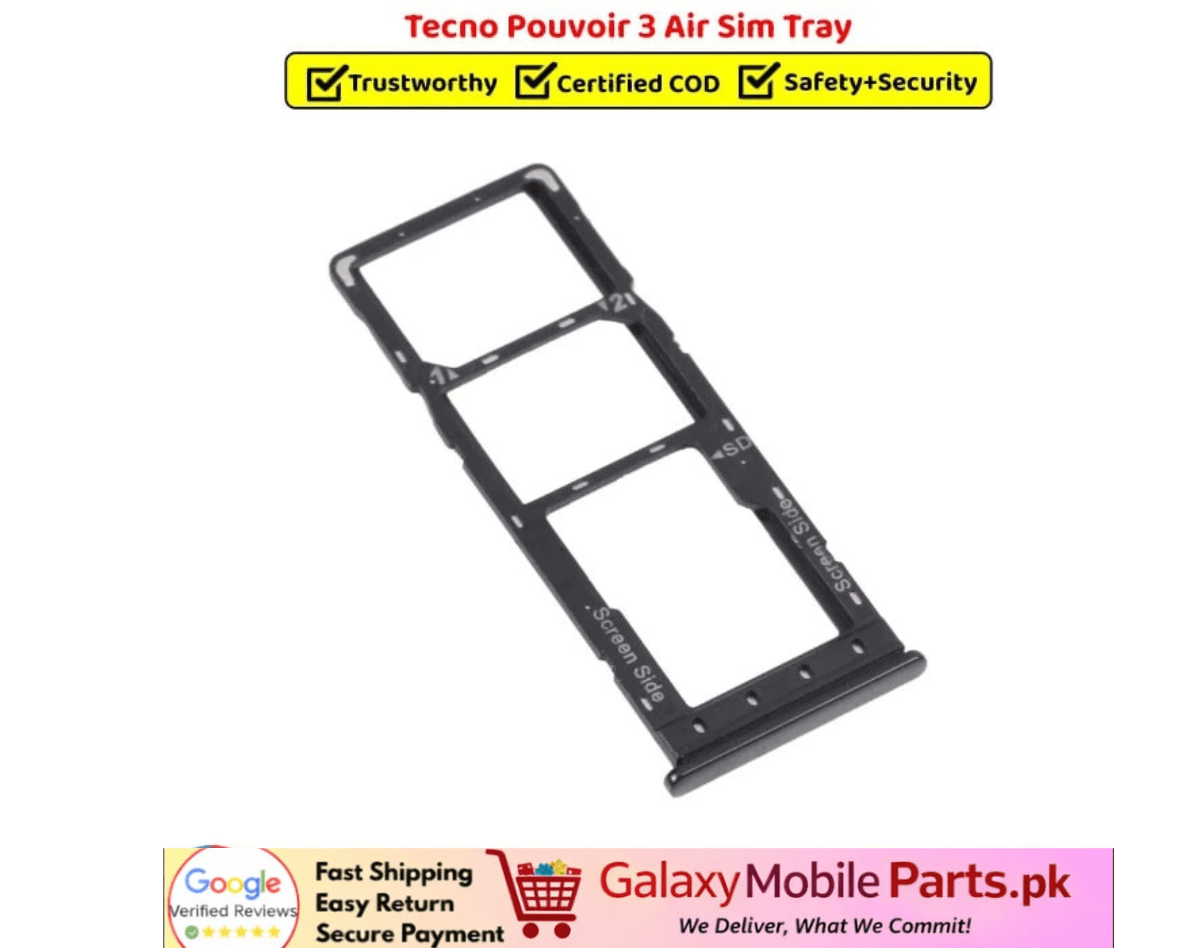 Tecno Pouvoir 3 Air Sim Tray is a premium quality smartphone replacement part designed especially for Tecno Pouvoir 3 Air users who need a reliable and perfect fitting sim tray for their device This sim tray is manufactured with strong and durable material to ensure long lasting use and safe placement of the sim card inside the phone It is carefully crafted to match the original size shape and color so it fits smoothly without damaging the phone body or internal components